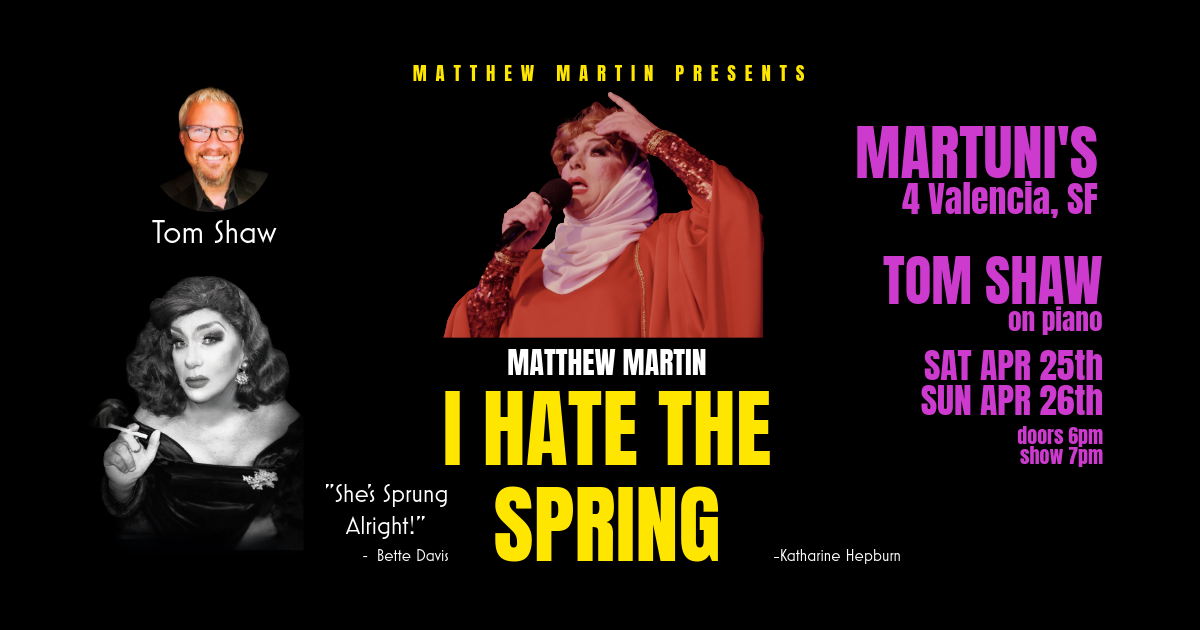 Matthew Martin, a native San Franciscan, has spent years delighting audiences by bringing classic Hollywood legends to life on stage and screen — from Katharine Hepburn, to Bette Davis, Joan Crawford, Judy Garland and beyond. An actor, singer, dancer, director, choreographer, and master of transformation, Matthew has appeared in numerous productions, including D’Arcy Drollinger’s upcoming film Lady Champagne. He recently reprised his beloved role as Blanche Devereaux in The Golden Girls Christmas Show at the Curran Theater. Matthew is thrilled to return to Martuni's, bringing you I HATE THE SPRING.