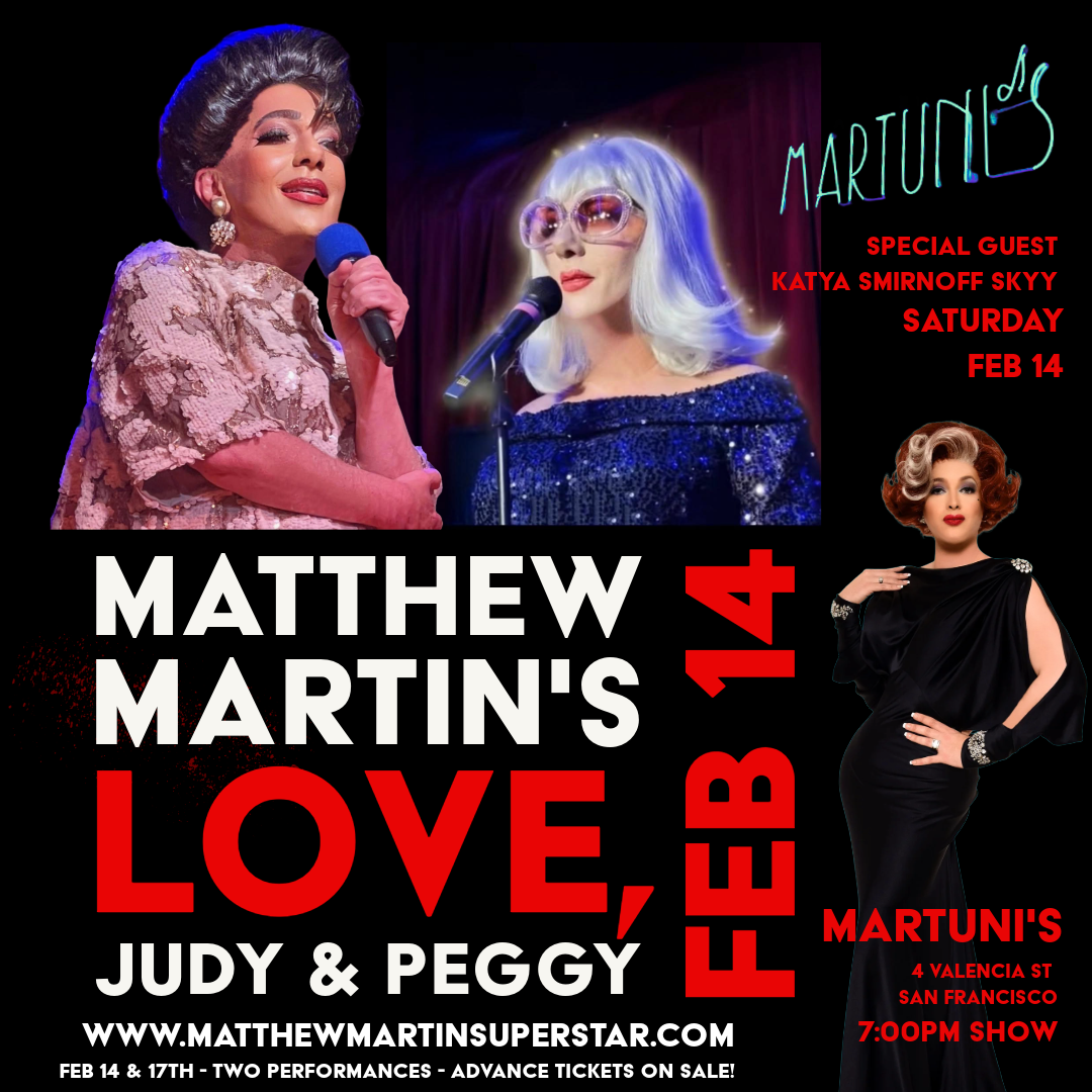 Matthew Martin sings live at Martuni's: LOVE, JUDY & PEGGY with Tom Shaw on piano and special guest: Katya Smirnoff-Skyy (Feb 14 only!)